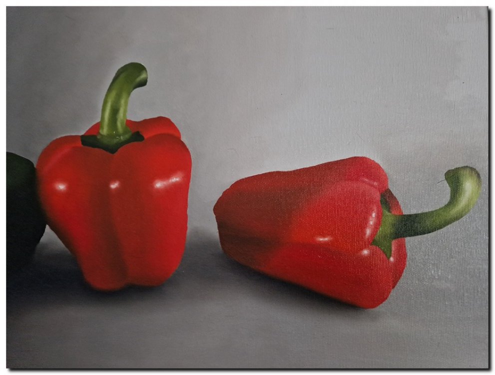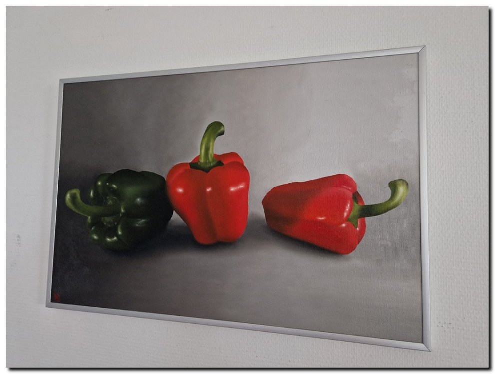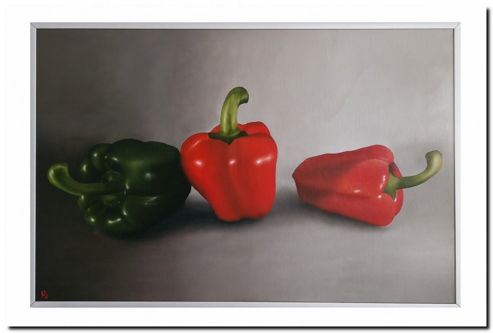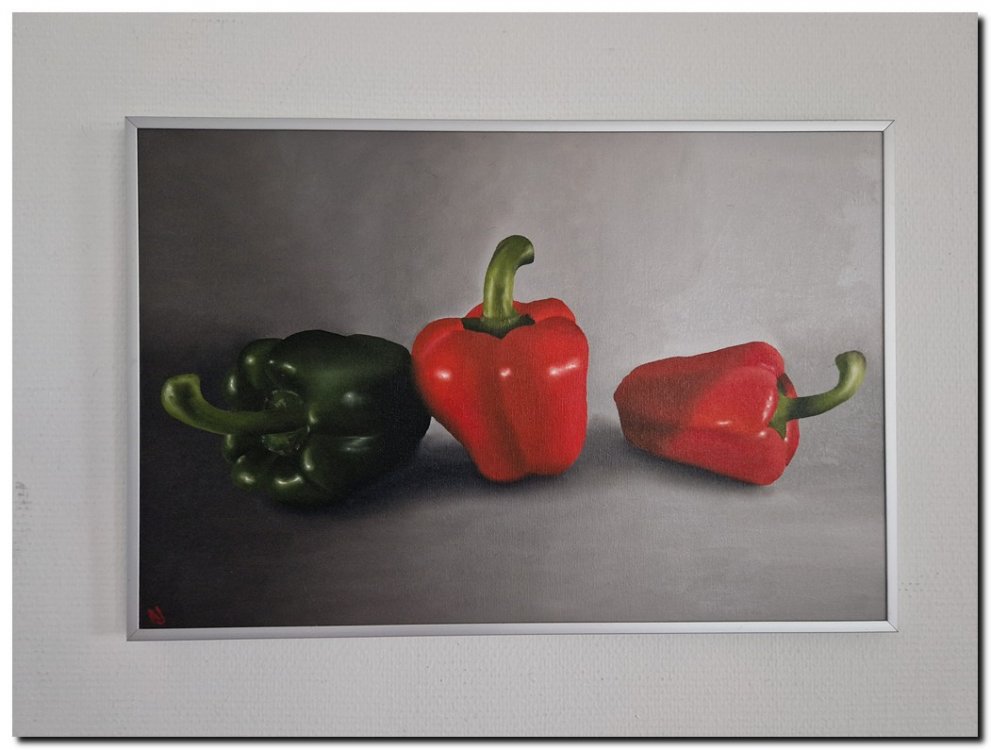 De inspiratie voor dit schilderij kwam letterlijk uit het dagelijks leven — de groenteafdeling van de supermarkt. Soms kan iets heel gewoons, zoals paprika’s, een kunstenaar raken door hun kleur, glans of vorm. Anne Jurjen (Ajo) Oppedijk zag in deze paprika’s niet alleen groente, maar sculpturen van licht en schaduw.