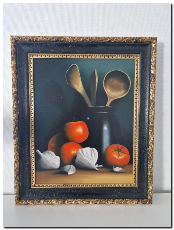 De warme roodtinten van de tomaten en het aardse bruin van de lepels vormen een harmonisch contrast met de diepe, bijna fluwelige achtergrond. Het licht komt van opzij en lijkt over de objecten te glijden, waardoor ze tastbaar en levend aanvoelen. Met verfijnde penseelvoering en ingetogen symboliek toont Oppedijk dat humor en stilte elkaar niet uitsluiten — ze versterken elkaar in evenwicht.