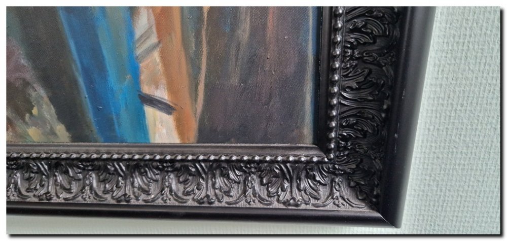 Het schilderij is omlijst met een elegante licht barokke houten lijst in zwart (buitenmaat 132 × 172 cm). De subtiele ornamenten en diepe zwarte kleur geven het werk een chique en klassieke uitstraling, terwijl het schilderij zelf volledig tot zijn recht komt.